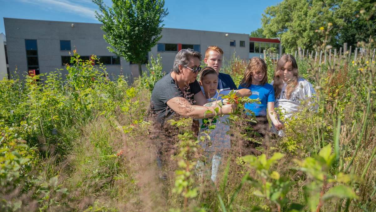 De trots van de school: ons fantastisch groene schoolplein en aangrenzende Vlinderbos. Ons onderwijs is groen! En dat zullen de kinderen merken ook. Zij kunnen ravotten, ontdekken en grenzen verleggen in de natuur rond de school. Zo kunnen ze zich ‘natuurlijk’ opladen tussen de lessen door. Ook maken ze gebruik van onze twee buitenlokalen: gezellige zitjes met schoolbord in de buitenlucht, waar we stilstaan bij het mooie van de natuur of waar we gewoon een reken- of taalles doen.